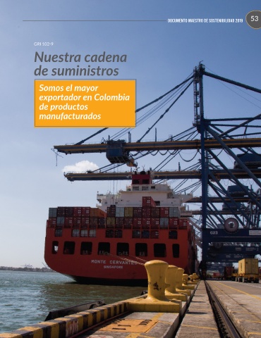 53 DOCUMENTO MAESTRO DE SOSTENIBILIDAD 2019 GRI 102-9 Nuestra cadena de suministros Somos el mayor exportador en Colombia de productos manufacturados
